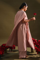 Classic-fit textured shirt with a soft round neckline and hem, layered with a cape-style flared overlay featuring side slit and delicate button detailing. Designed in an airy, fluid silhouette and paired with straight-fit trousers