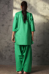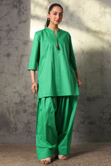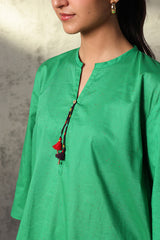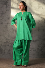 Classic-fit shirt with a low band neckline and playful tassel detailing along the V-slit. Designed with subtle drop shoulders. Paired with a matching farshi shalwar featuring fine stitching detail along the borders.