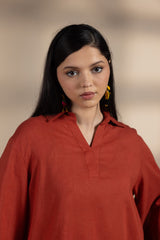 Relaxed-fit shirt designed with a collar neckline and subtle drop shoulders, offering an easy, modern silhouette. Paired with classic culottes for a balanced chic look.