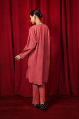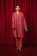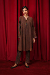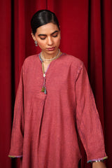 A crinkle cotton relaxed-fit kurta features a round neckline with a V-slit, enhanced with colorful stitching details. The gathers at the neckline are adorned with thread tassels and shell accents for added charm. The sleeve hems also showcase colorful stitching, bringing cohesion to the design. Paired with solid straight-fit trousers, this ensemble combines comfort and vibrant style..
