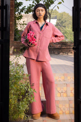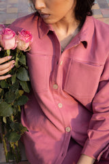 Cloud-soft classic-fit button-down shirt crafted with drop shoulders, featuring dual pockets and a relaxed, easy silhouette. Designed with a curved hem and clean topstitch detailing for a polished everyday look. Paired with soft sweatpants that offer easy movement and all-day comfort.