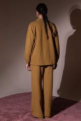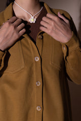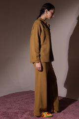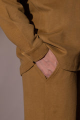 Cloud-soft classic-fit button-down shirt crafted with drop shoulders, featuring dual pockets and a relaxed, easy silhouette. Designed with a curved hem and clean topstitch detailing for a polished everyday look. Paired with soft sweatpants that offer easy movement and all-day comfort.