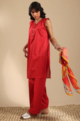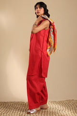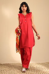 Classic-fit dotted shirt with a low band neckline, with crochet lace detailing and pearl accents along the front slit. Designed with delicate pleats on the shoulders and fringe detailing along sleeve hems. Paired with a coordinated khula poncha shalwar. Comes with a printed silk scarf.