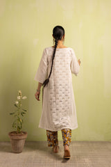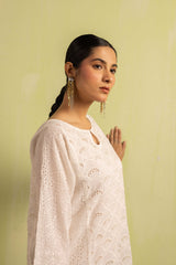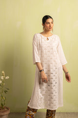 A classic-fit solid-hued Schiffli pattern kurta with a round neckline and keyhole detail. The kurta is adorned with intricate, exclusive Schiffli embroidery, offering a delicate and refined look. Pairs effortlessly with any Generation fits for a versatile ensemble.