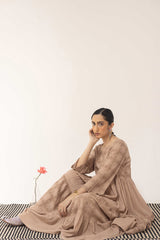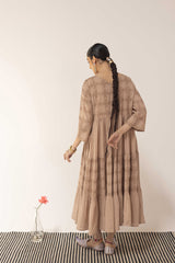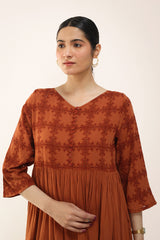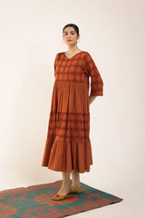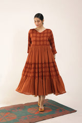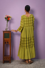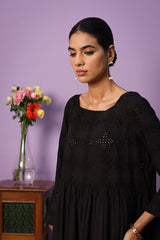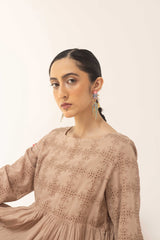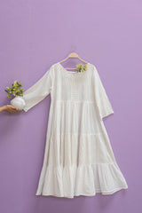 A tiered frock showcasing an intricately designed schiffli pattern, complemented by a V-neckline adorned with delicate button detailing. The bodice and sleeves feature fine embroidery on an exquisitely crafted Schiffli design. Gathered tiers enhance the silhouette, further accentuated by Schiffli cutwork inserts, adding a touch of elegance and graceful movement.