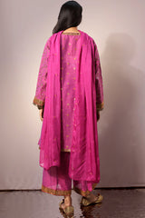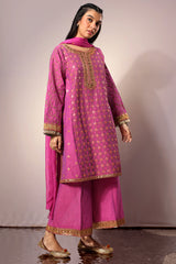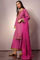 Embroidered classic-fit paneled kurta adorned with an intricate neckline and sleeve hems, enhanced with sequin detailing and an all-over embroidered jaal. Paired with culottes featuring matching embroidered border detailing and styled with a dupatta sprinkled with sequin accents.