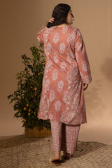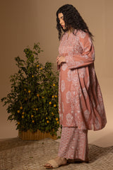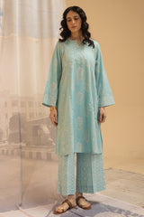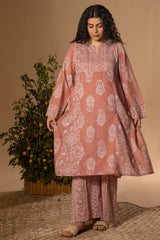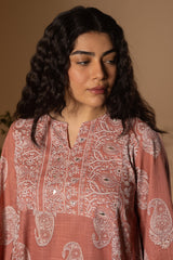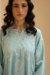 Classic-fit printed shirt with a round neckline and V-slit, adorned with subtle mukaish detailing on the bodice. Paired with coordinated printed culottes for a refined look.