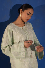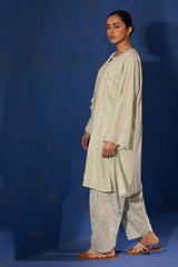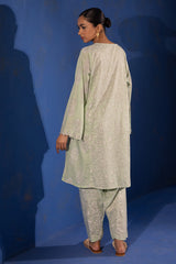 Paisley panel-printed kurta with a round neckline and V-slit, finished with tassel detailing. Delicate bead accents highlight the sleeve hems. Paired with a matching printed classic-fit shalwar.