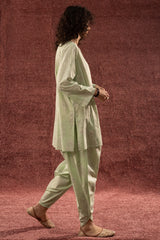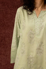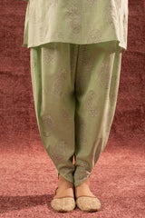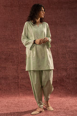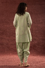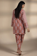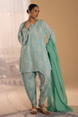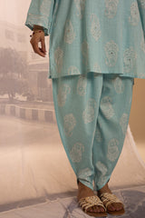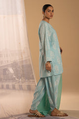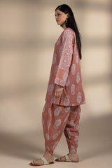 Paisley-printed classic-fit shirt with a round neckline and V-slit, subtly accented with mukaish detailing across the motifs. Paired with a matching printed tulip shalwar.