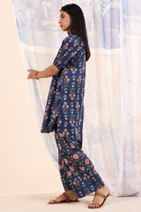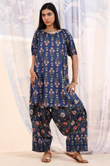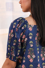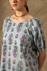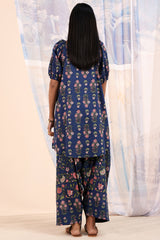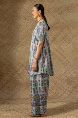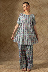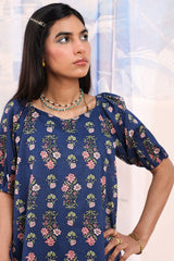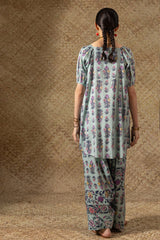 Printed relaxed boxy-fit shirt with subtle puff sleeves and cinched sleeve hems. Finished with a rounded hem. Paired with a matching printed farshi shalwar.