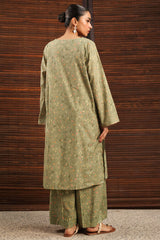 Printed classic-fit shirt adorned with delicate embroidered detailing along the neckline and sleeve hems. Paired with matching printed culottes.