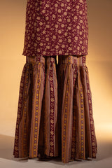 Classic-fit printed A-line shirt designed with a square neckline, delicately accented with subtle mukaish detailing. Paired with a coordinated printed gharara.