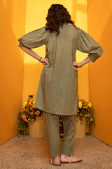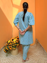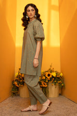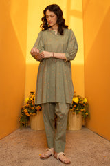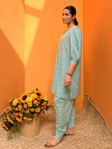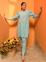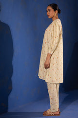 Soft floral printed classic-fit shirt with a keyhole neckline, adorned with delicate lace detailing along the neckline and cuffed sleeve hems. Paired with a matching printed pegged shalwar.