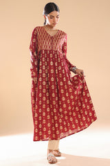 Printed long flared dress designed with a V-neckline and button detailing along the front slit. Soft gathers around the bodice add movement and depth, creating an flowy silhouette.