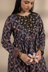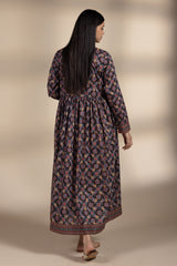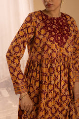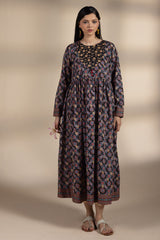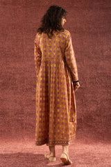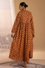 Long flared printed dress with a round angrakha neckline with button detailing along the front slit. Soft gathers at the empire waist create a fluid, graceful silhouette.