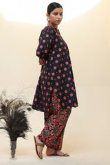 Relaxed-fit printed shirt with side pockets for added comfort. Delicate pleat detailing at the back enhances ease of movement, finished with a rounded hem. Paired with a coordinated printed classic-fit shalwar.