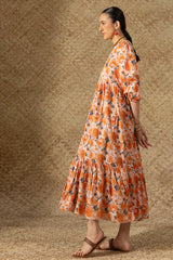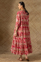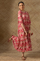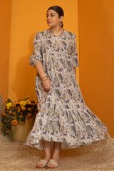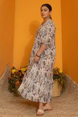 Soft floral printed long, tiered dress with a V-neckline, adorned with delicate crochet lace detailing and cinched sleeve hems. Gentle gathers create a flowing, dancing flare that enhances the silhouette.