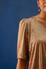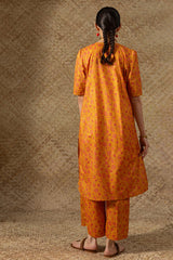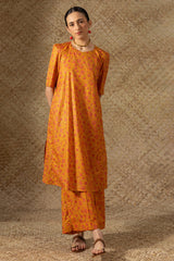 Gold printed classic-fit shirt adorned with delicate mukaish detailing along the neckline and sleeve hems. Designed with soft puff sleeves. Paired with matching printed culottes.