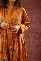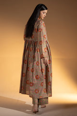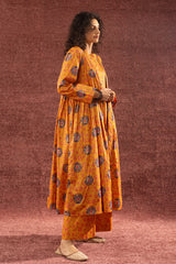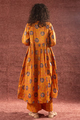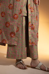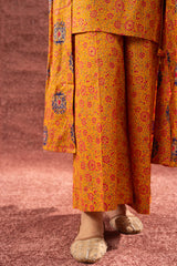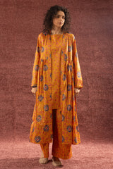 Gold printed long front-open Jama, adorned with tassel detailing and soft gathers around the empire waist that create a graceful, flowing silhouette. Layered over a classic-fit gold printed sleeveless shirt with a square neckline, paired with matching printed culottes to complete the coordinated ensemble.