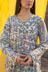 Printed classic-fit shirt with a V-neckline, refined with loop button detailing along the front slit. Paired with a matching printed farshi shalwar, finished with subtle border stitching.