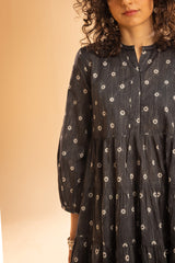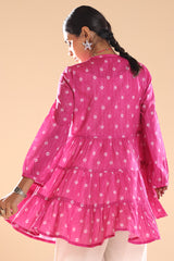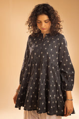 Polka-dot printed tiered peplum top designed with a low band neckline and an overlap placket. Versatile in style, it can be paired with a variety of Generation bottoms.