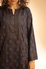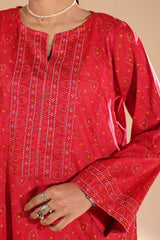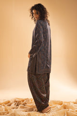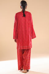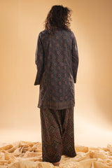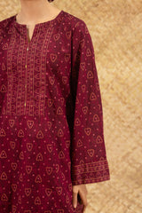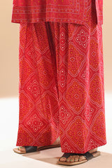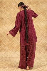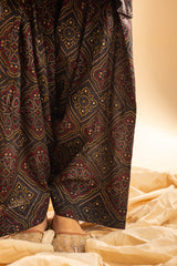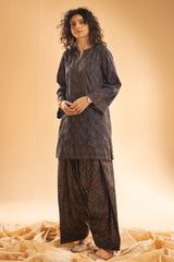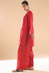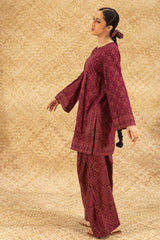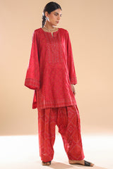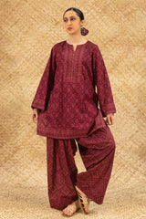Chunari-printed classic-fit shirt with a round neckline and V-slit, delicately adorned with mukaish detailing along the front slit. Paired with a coordinated printed farshi shalwar for a traditional silhouette.