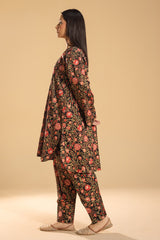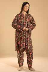 Classic-fit printed shirt with a round neckline and an overlapping placket, finished with a softly rounded hem. Paired with a matching printed pegged shalwar, detailed with fine stitching along the borders.