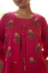 Classic-fit shirt with a round neckline, Styled with a classic-fit short front-open sleeveless koti featuring tassel detailing. Paired with a coordinated printed classic-fit shalwar.
