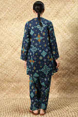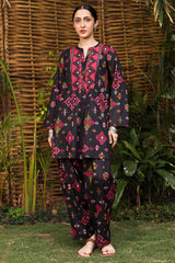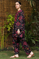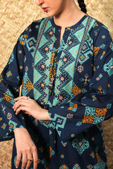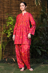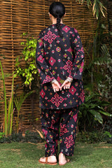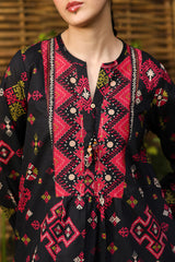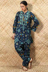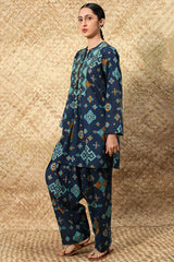 Printed classic-fit shirt with a low band neckline, featuring a V-slit with button and tassel detailing. Designed with gathers at the empire waist to create a flared silhouette. Paired with a matching printed classic-fit shalwar.