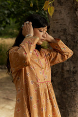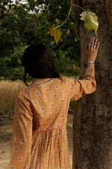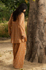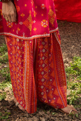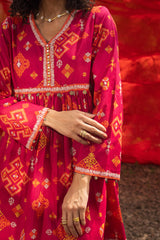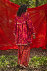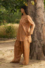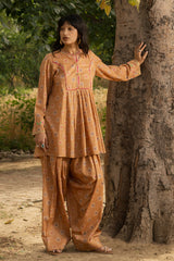 Printed gathered shirt with a V neckline, adorned with sequin detailing along the front slit and coin embellishments at the empire waist and sleeve hems. Gathers create a softly flared silhouette. Paired with a coordinated printed farshi shalwar.