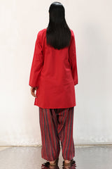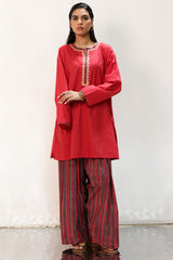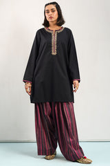 Classic-fit shirt with a round neckline and V-slit, adorned with Susi-patterned detailing along the neckline and sleeve hems, and enhanced with delicate embroidery along the neckline. Paired with a Susi-patterned farshi shalwar for a coordinated, traditional look.