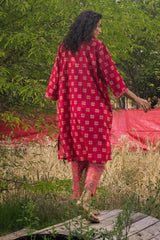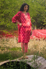 Classic-fit printed shirt with a round neckline and V-slit, adorned with subtle pleat detailing for a flared silhouette. Paired with coordinated printed straight-fit trousers.