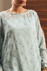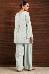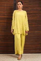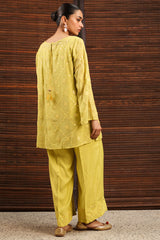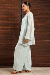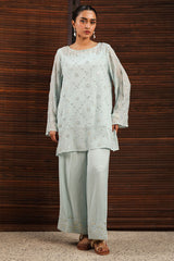 Embroidered classic-fit shirt with a round neckline, adorned with delicate stitching detail. Features an all-over embroidered jaal enhanced with panni work. Designed with a keyhole back finished with tassel detailing. Comes with an inner for added comfort and ease. Paired with coordinated culottes finished with embroidered borders.