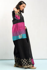 Color-blocked classic-fit shirt with a round neckline and V-slit, with soft puff sleeves finished with golden woven sleeve hems. Adorned with embroidered motifs on the front and back. Comes with an inner for added comfort. Paired with a classic farshi shalwar featuring embroidered detailing along the borders and a golden woven hemline. Styled with golden-striped dupatta.