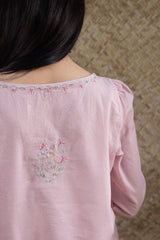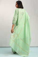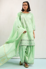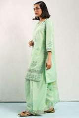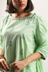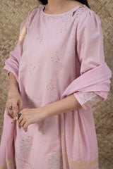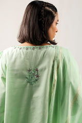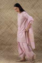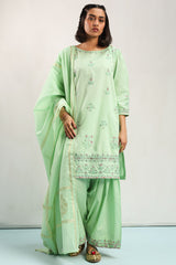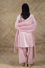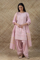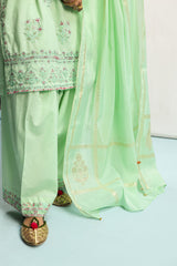 Hand-embroidered classic-fit shirt with a round neckline, featuring a side slit with loop button detailing. Finished with gota lace along the sleeve hems. Paired with a farshi shalwar adorned with embroidered borders and complemented with a lurex-accented dupatta.
