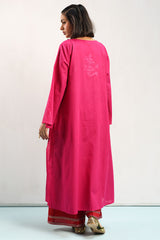 Floral-embroidered classic-fit paneled shirt with a round neckline and V-slit, featuring a subtle front opening. Finished with lace detailing along the sleeve hems. Can be paired with any Generation bottoms.