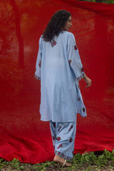 Hand block printed classic-fit paneled shirt with a round neckline and V-slit, adorned with delicate stitching details. Paired with a coordinated printed classic-fit shalwar.