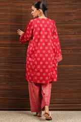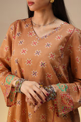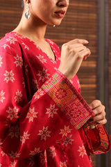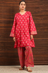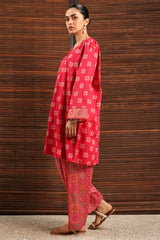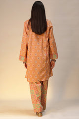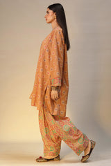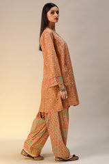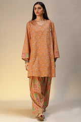 Printed paneled shirt with a V-neckline, adorned with sequin detailing along the neckline. Paired with a coordinated printed classic-fit shalwar.