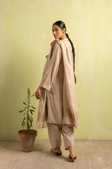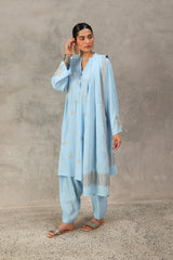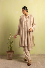 A formal kurta featuring a band neckline with a V-slit, adorned with delicate gota accents on the front placket. Intricate floral gota motifs grace the front and sleeves, exuding understated elegance. Paired with a classic solid-hued shalwar and a dupatta edged with a gold denier border and tassel details, this ensemble embodies eternal refinement.