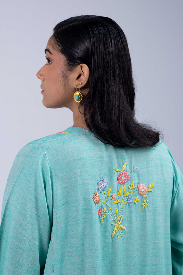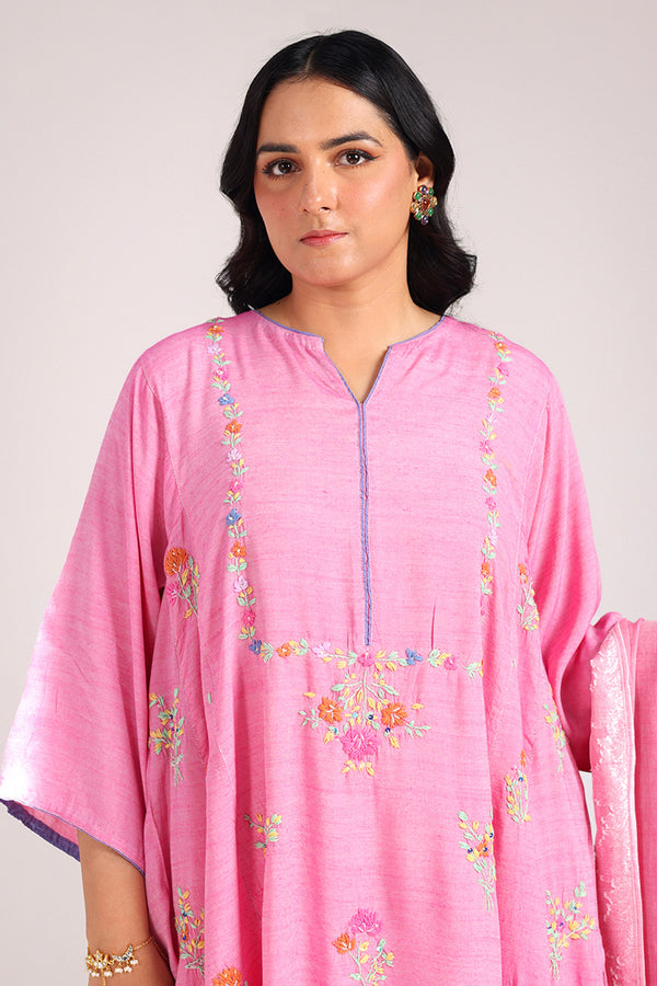 An embroidered formal, classic-fit paneled kurta featuring a round neckline with a V-slit, adorned with intricate tilla, panni, and resham threadwork. The sleeves mirror this delicate detailing, adding a refined touch. Paired with straight-fit trousers and a soft inner for added comfort. The look is completed with an organza dupatta featuring scalloped borders, scattered motifs, mirror work, and tassel detailing for a festive finish.