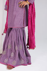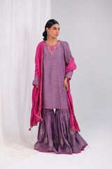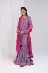 An embroidered shirt featuring a round neckline with a V-slit, highlighted by delicate zardozi detailing. The sleeve hems and shirt border are finished with dori piping, adding a subtle shine. Comes with an inner for added comfort and ease. Paired with a crushed dupatta and matching embroidered gharara, perfect for festive occasions.