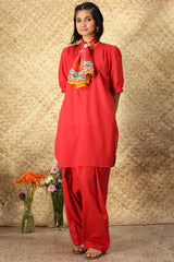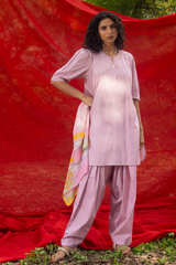 Classic-fit dotted shirt with a low band neckline, with crochet lace detailing and pearl accents along the front slit. Designed with delicate pleats on the shoulders and soft puff sleeves with cuffed hems. Paired with a coordinated khula poncha shalwar. Comes with a printed silk scarf.