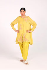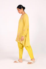 An embroidered open-slit kurta featuring a round neckline and a flared front slit design. Adorned with delicate embroidered motifs enhanced by subtle bead embellishments throughout. The cuffed sleeves are also decorated with beadwork. Comes with a comfortable solid inner for ease, paired perfectly with solid pegged shalwar for a polished look.