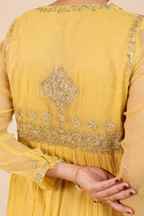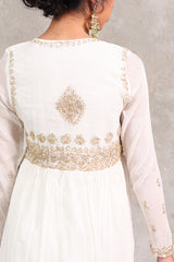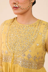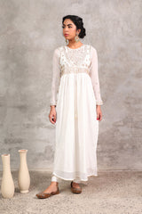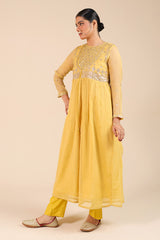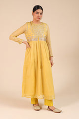 A classic-fit printed Anarkali-style shirt adorned with delicate embroidery, finished with stitching and tassel accents. Gathers at the waist add graceful flare, while gota lace highlights the sleeve hems, side slits, and hem. Paired with straight-fit trousers.