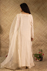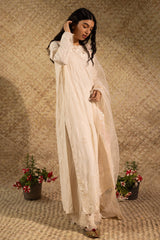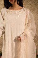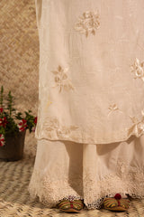 Embroidered relaxed-fit shirt featuring a boat neckline and floral self-embroidery throughout. The embroidered sleeves are finished with a button closure and delicate lace detailing. Paired with matches wide-leg trousers finished with lace detailing along the edge. Styled with a matching embroidered organza dupatta with an iridescent sequin border.