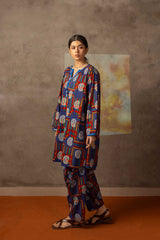 A loose-fit classic printed kurta featuring a round neckline with a V-slit, adorned with button and tassel details. The neckline and placket are framed with a solid trim for a defined finish. Cinched sleeves add structure, Paired with matching printed classic-fit shalwar is adored with running stitch details along the ankle hemline, completing the look with subtle refinement.