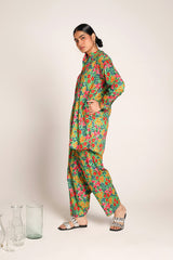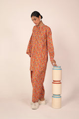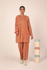 A seamless floral printed short-length kurti features a band neckline and buttons along the front placket. The cuffed sleeves add a refined touch, while the kurta is paired with matching printed classic fit shalwar, enhanced with stitching detail around the ankle hemline.