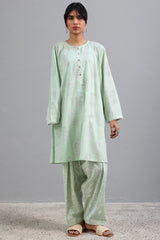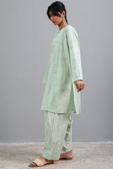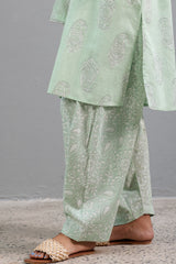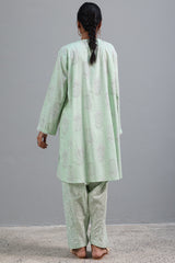 Classic-fit printed shirt with a round neckline and buttoned front placket, adorned with delicate lace detailing along the placket and sleeve hems. Paired with a coordinated printed classic-fit shalwar.