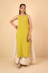 A fitted sleeveless shirt with round neckline, featuring embroidery detailing on the neckline and all over.