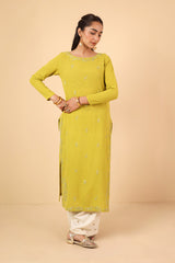 A fitted full-sleeved shirt with a round neckline, featuring embroidery detailing on the neckline and all over and on the back.